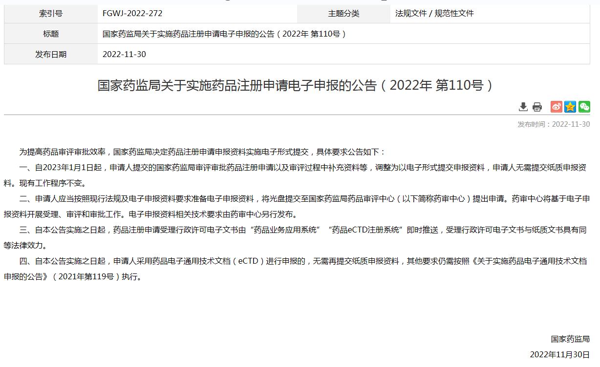 國(guó)家藥監(jiān)局關(guān)于實(shí)施藥品注冊(cè)申請(qǐng)電子申報(bào)的公告(2022年第110號(hào))