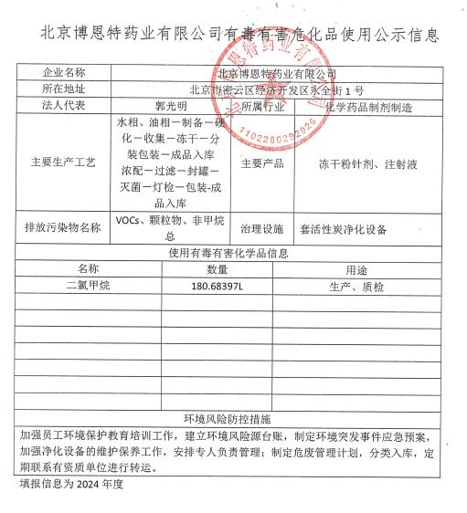 北京博恩特藥業有限公司危險化學品使用公示信息
